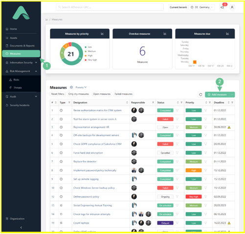 Um eine neue Maßnahme zu erstellen, gehen Sie auf die Übersichtsseite Maßnahmen (1) und klicken auf Neue Maßnahme (2).