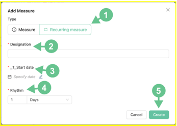 Tragen Sie die Bezeichnung (2) ein, wählen Sie das Startdatum (3) der ersten Durchführung der Maßnahme und den Rhythmus (4) (z. B. täglich, wöchentlich) aus.